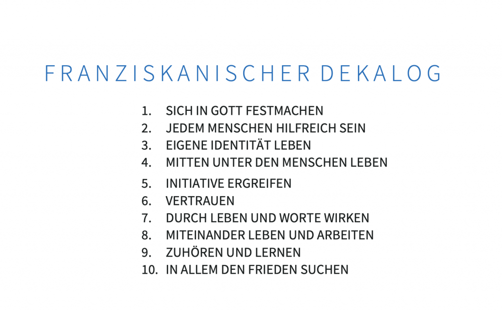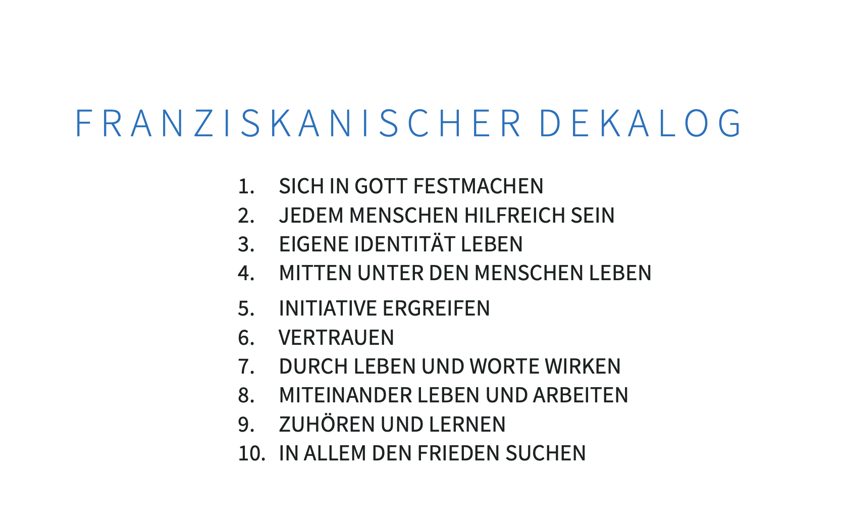 Assisi ist ein kleines Städtchen in Italien. Franziskus war ein ziemlich verwöhnter reicher junger Mann. Seine Eltern schenkten ihm alles, was er sich wünschte, und er genoss das Leben. Irgendwann wurde es ihm aber langweilig, dass er alles hatte, und er dachte: das kann doch nicht alles sein. Dabei entdeckte er, dass er nur wirklich glücklich sein konnte, wenn er fragte, was Gott von ihm haben will. Und so änderte er sein Leben, kümmerte sich um Arme und Kranke und betete viel. Dabei war er so froh und glücklich, dass auch andere junge Männer von ihm angesteckt wurden, und er nannte sie Brüder. So entstand der Orden der Franziskaner.
