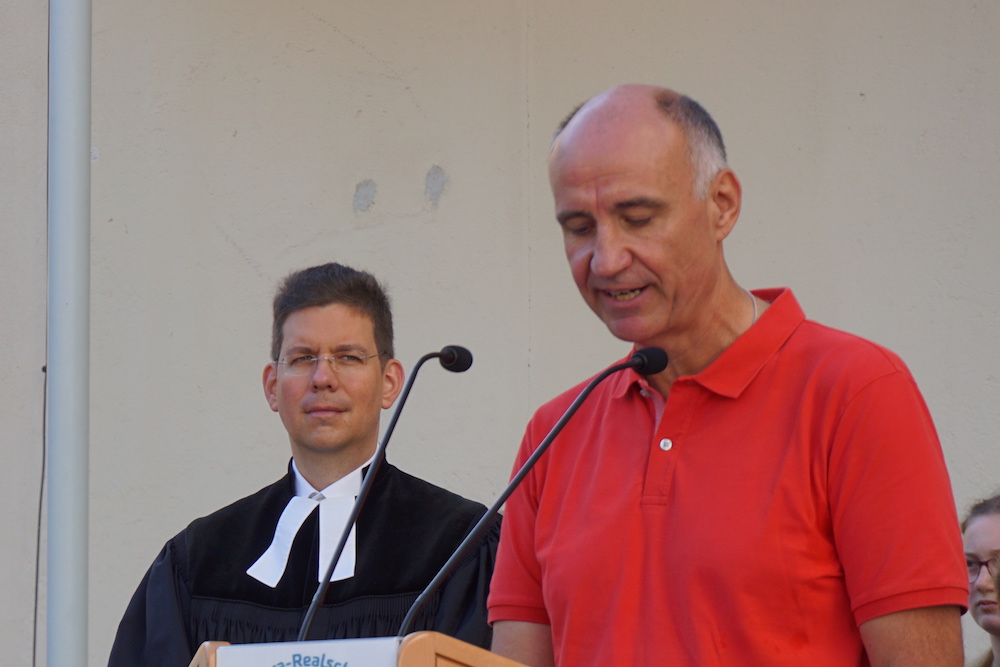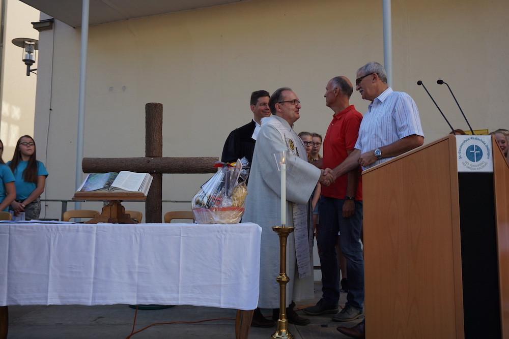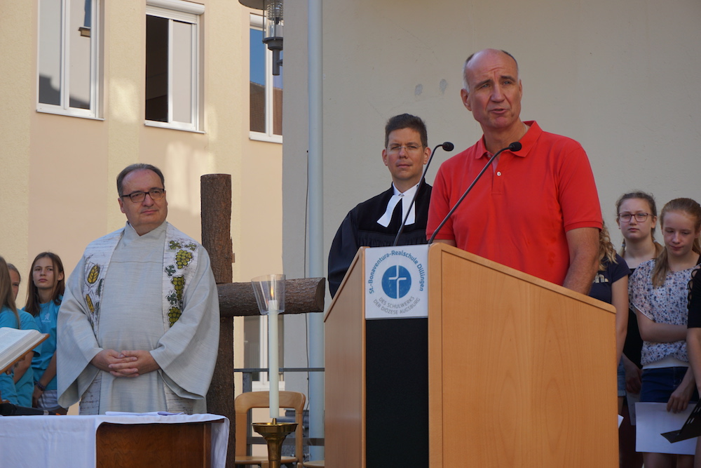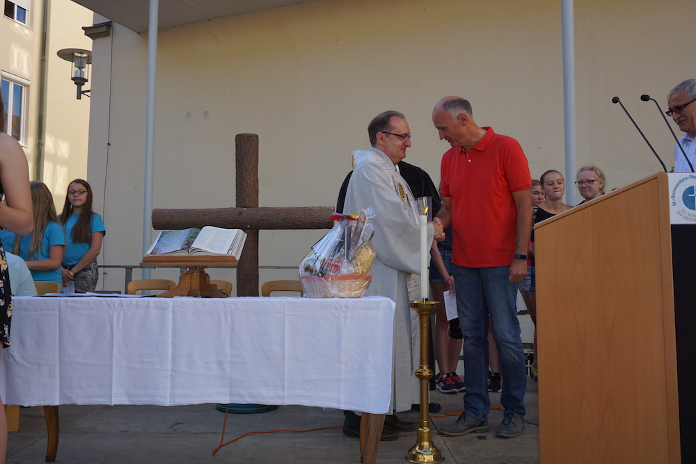 Im Rahmen des Schlussgottesdienstes wurden von Schulleiter Oliver Stahl auch Verabschiedungen und Ehrungen vorgenommen. Frau Bulla und Frau Falk verlassen das Bona, um neue Tätigkeiten aufzunehmen, Herr Straßer tritt in den Ruhestand. Ihnen allen dankte H. Stahl für ihre langjährige und äußerst verdienstvolle Arbeit am Bona.