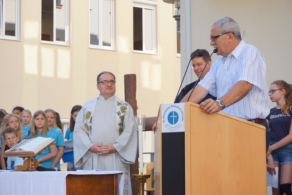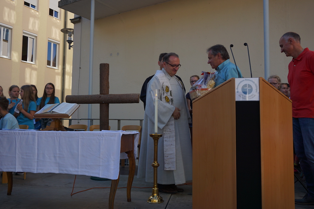 Ein besonderes Highlight war die Begrüßung aller neuen Lehrkräfte und die feierliche Aufnahme der neuen SchülerInnen der 5. Klassen, indem sie ein bedeutendes Symbol unserer Schule, das Tau-Kreuz, von einem ihrer TutorInnen oder Lehrer überreicht bekommen haben. Nun kann das neue Schuljahr beginnen!