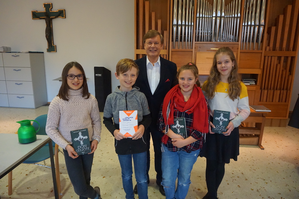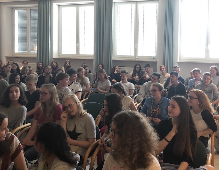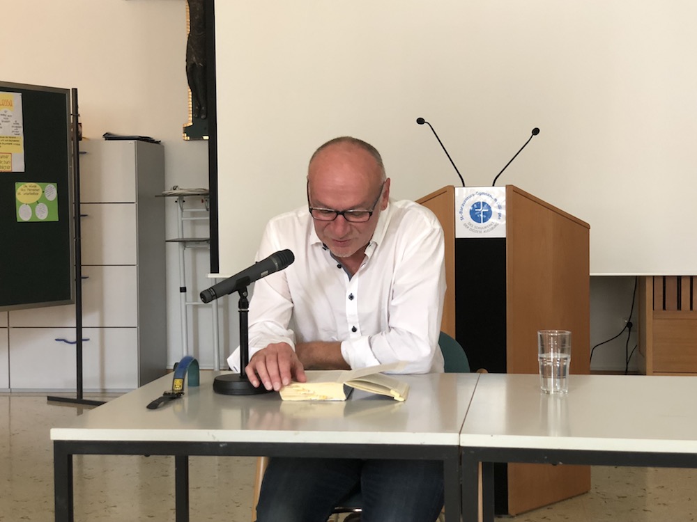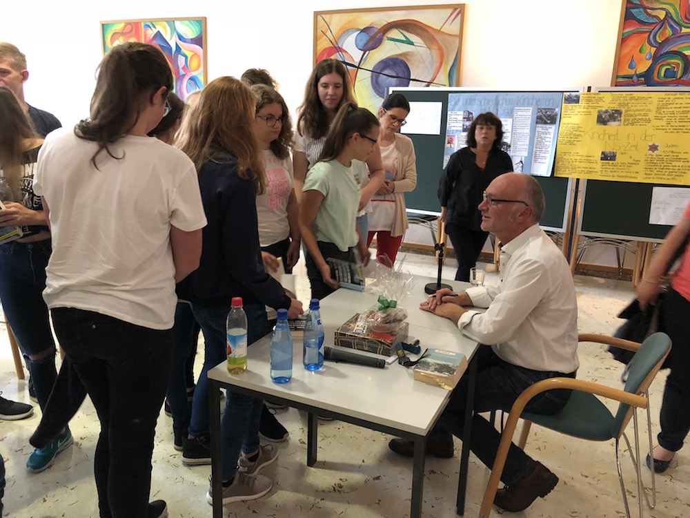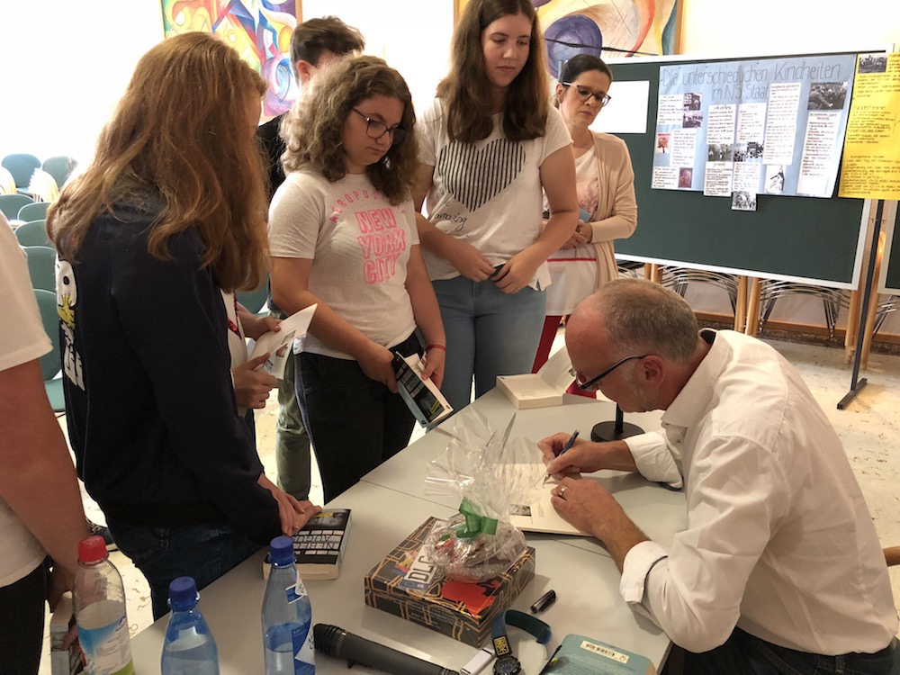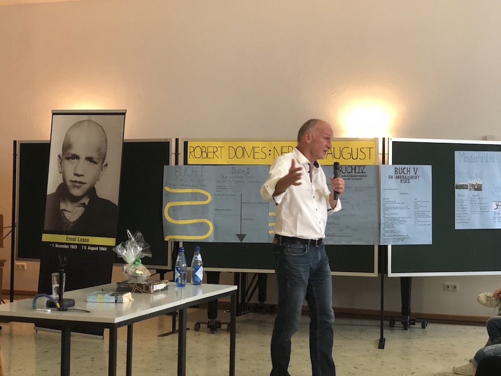 Anschließend folgte eine lange Fragerunde, da die 9. und 10. Klassen das Buch als Klassenlektüre gelesen hatten. Die Schüler und Schülerinnen wollten weitere Details wissen, die Robert Domes aufgrund seiner Recherchen und der langjährigen Auseinandersetzung mit der Thematik ausführlich erklären konnte. Vor allem kamen Fragen zu Lossas Familie und auch zur Tätigkeit als Schriftsteller.