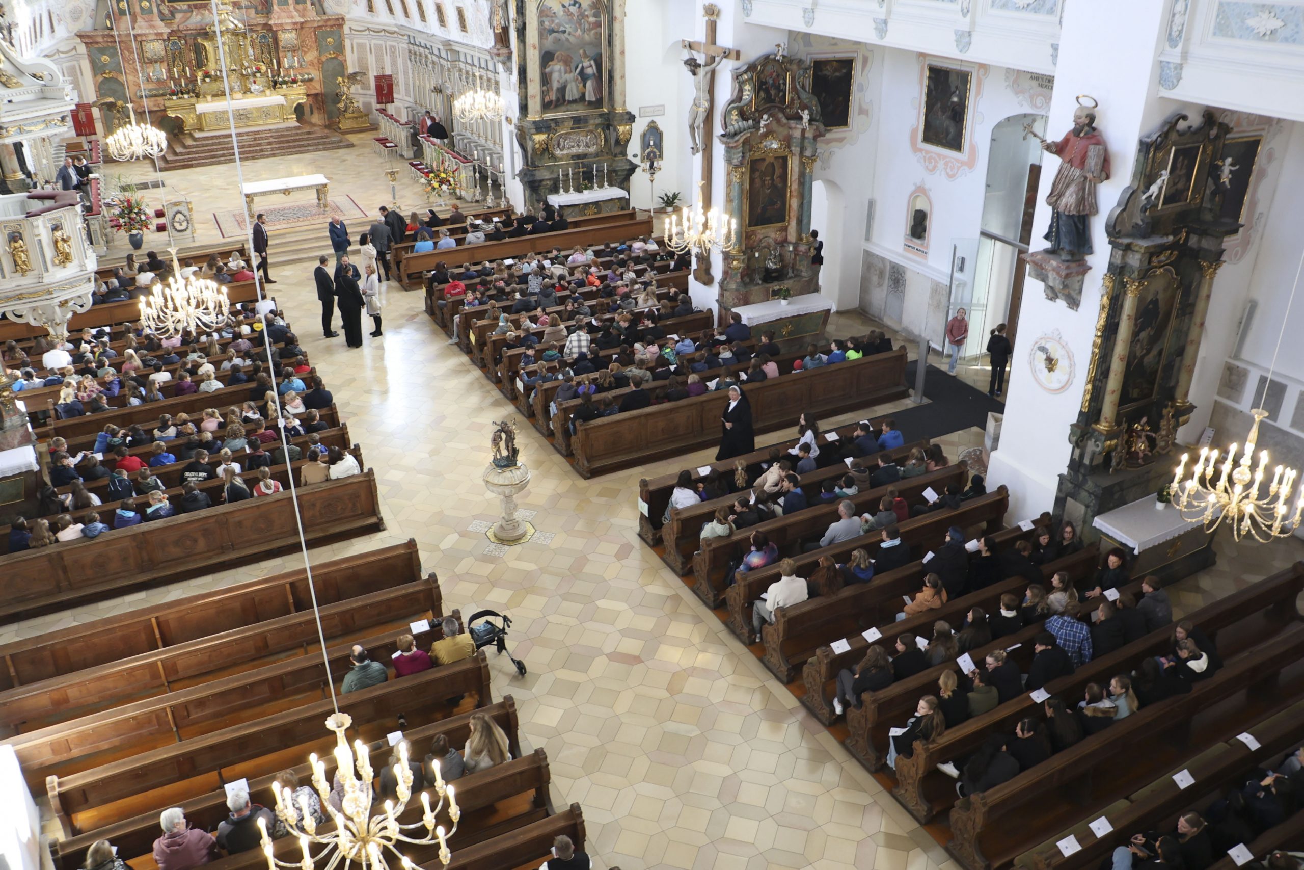 Den Auftakt bildete ein feierlicher Gottesdienst unter der Leitung von Bischof Bertram Meier, Weihbischof Wörner, Erzabt Wolfgang Öxler und Stadtpfarrer Heinrich. In der feierlich geschmückten Basilika kamen Schülerinnen und Schüler aller Bona-Schulen, Lehrkräfte, Vertreterinnen und Vertreter des Schulwerks sowie zahlreiche Gäste zusammen, um diesen besonderen Moment gemeinsam zu begehen.