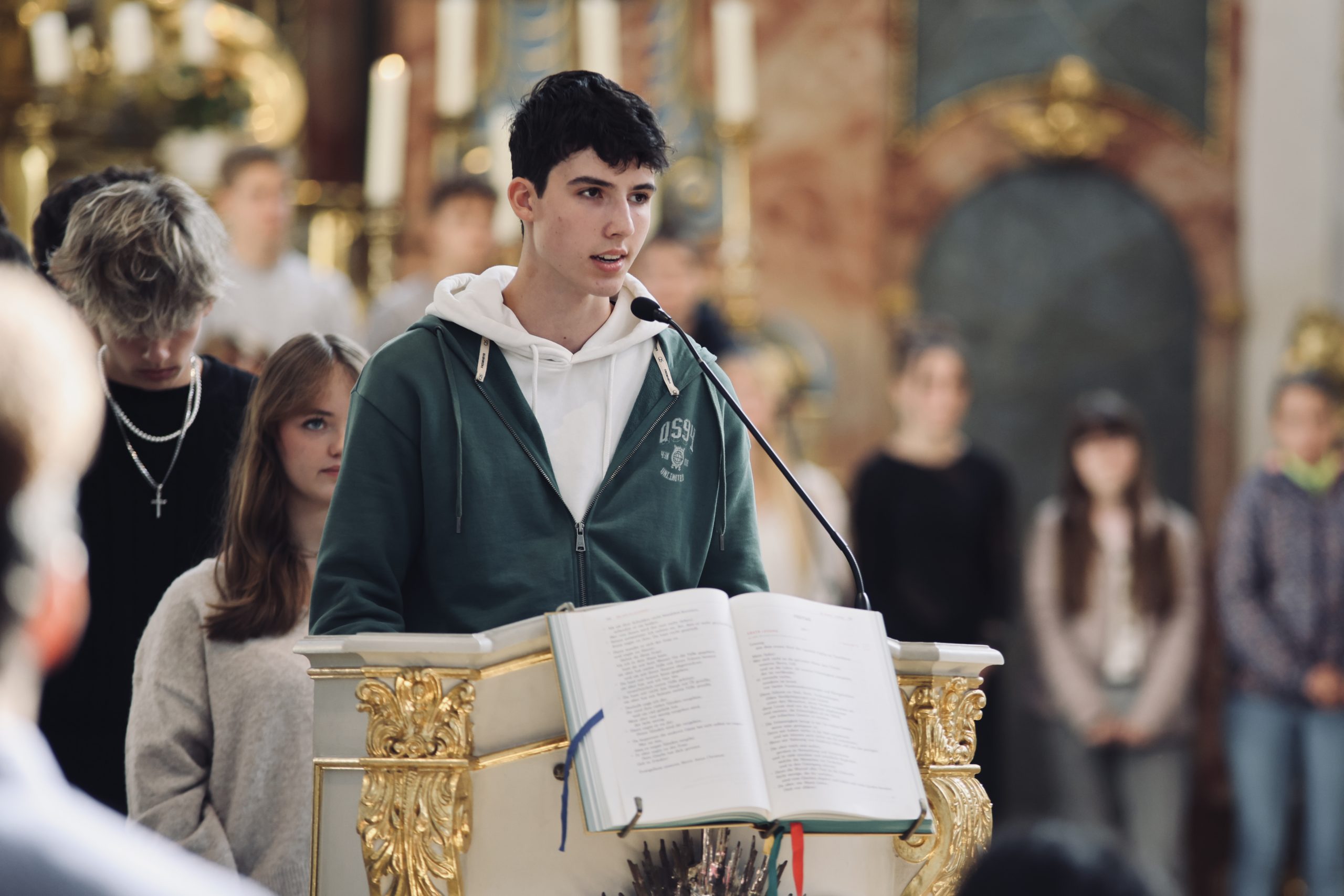 „Einer schätze den anderen höher ein als sich selbst“ (Phil 2,3), so der Wunsch des Apostels Paulus, der an alle Anwesenden der Schulfamilie als Aufforderung für die kommende gemeinsame Zeit des Lernens und Lehrens erging. Veranschaulicht durch die alte jüdische Erzählung von den beiden Brüdern auf dem Berg Morija wurde eindrucksvoll aufgezeigt, dass gegenseitige Wertschätzung und zuvorkommende Hilfe zum Gelingen jeder Gemeinschaft beitragen können. In den von SchülerInnen der Oberstufe selbst formulierten und vorgetragenen Fürbitten klang dieser Impuls ebenso an wie die Anliegen rund um das Motto für das neue Schuljahr „BONA NATURA“ und die großen Sorgen und Nöte der Gegenwart.